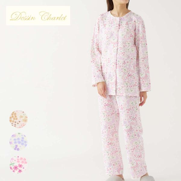 50%OFFデッサンシャーレ パジャマ レディース 肌側綿100% ソフトキルト 幾何小花柄 Lサイズ Dessin Charlet 前開き 長袖 長丈パンツ 女性 婦人 73973133