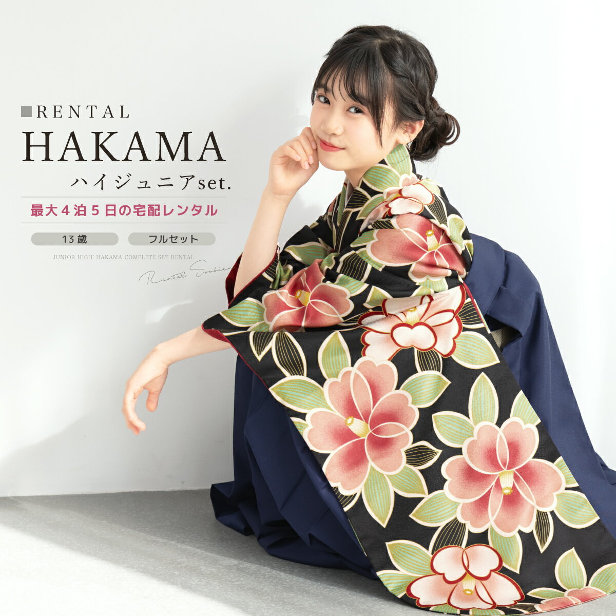 【100名限定50%OFF】最新作早割★SS特別クーポン 【レンタル】袴セット 卒業式 袴 小学生 女の子 ジュニア フルセット 着物 黒 レッド 白 椿 花柄 モダン 13歳 十三参り 140 150 160 着物セット はかま 和装 中学生 ジュニア袴 創美苑 往復送料無料