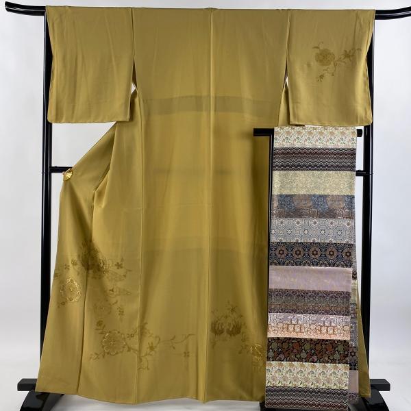 付下げ 身丈164cm 裄丈66cm M 袷 袋帯セット 向い鳥 華文 刺繍 ベージュ 正絹 美品 秀品 一つ紋 中古