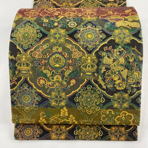 袋帯 逸品 龍村晋 落款あり 動物 草花 よもぎ色 全通 正絹 中古