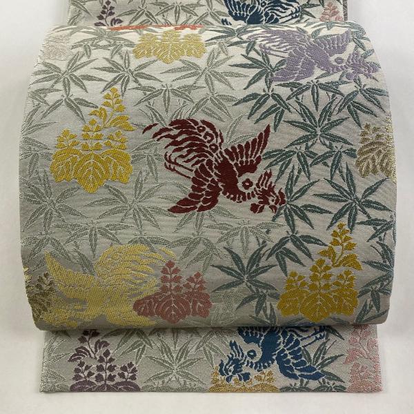 美品 袋帯 逸品 落款あり 華文 向かい鳥 箔 金銀糸 銀色 六通 正絹 中古