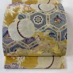 美品 袋帯 名品 貝紫 菊 鳥 刺繍 箔 金色 六通 正絹 中古