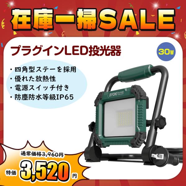 在庫一掃SALE LED投光器 30W スタンド付き 3000lm 広角120° 昼光色 IP65 防水 屋外 プラグ付き 5mコード 作業灯 100V 夜間作業 DIY 車整備 SK-P30W