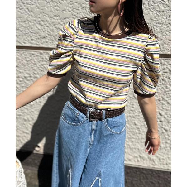 tシャツ マルチボーダーテレコ パフスリーブトップス レディース