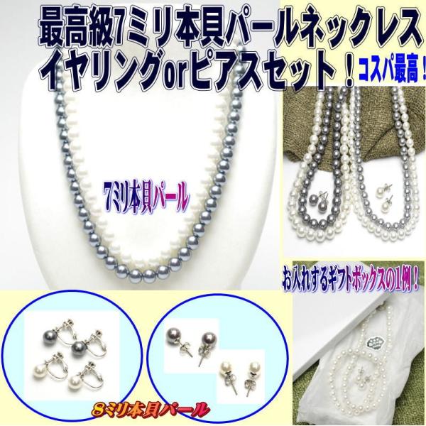 【あす楽】即日発送!送料無料!【高級ケース付】 メーカー希望小売価格はメーカー商品タグに基づいて掲載しています ◆日本製パールネックレスセット ◆白 ・グレー ◆16インチ(43cm)・18インチ(48cm) ◆ピアスかイヤリング付 素材 ・ネックレス本体: 国産天然貝核貝パール ・ネックレス留金: 真鍮ロジウム鍍金 サイズ 【ネックレス全長】(金具の長さ含む) ・8ミリ玉16インチ(43センチ) ・8ミリ玉18インチ(48センチ) ※16インチは定番の一番人気のあるサイズです! 備考 【ネックレス本体】・ネックレスは白かグレーが選べます ・ネックレス16インチか18インチ選べます 【ピアス・イヤリング】 ※おまけでピアスかイヤリング(同色貝パール8ミリ玉)どちらかをセットで付けます! ・イヤリング留金: 真鍮ロジウム鍍金 ・ピアスポスト:チタンポスト (ピアスのキャッチはシリコンキャッチと真鍮ロジウム鍍金のキャッチの2種類をお付けします) ※(ピアスはチタンポストで、金属アレルギーの方にもお勧めです) ※店頭価格4万円の本真珠と見比べても見劣りしません! ・高級ケース付 ・送料無料 ・即日発送 ■特徴■ 当店の貝パールは本真珠と同じ「天然の貝核」を使用し、 その上に天然貝殻を研磨して出来たパールエッセンスを、熟練の職人が何十層にも丹念に塗り重ねを行い、さらに色の落ちにくい特殊な染め加工を施した大変美しいジュエリーです。 核のない淡水パールとも違い重みもあって、ご満足いただける 仕上がりになっております。Aランクの貝パールのみ使用。 本真珠のような照りと光沢感を出す為に、仕上げに磨きをかけております。色は高級感のあるホワイトパールになります。 また本真珠に比べると「汗や皮脂汚れ」にも強く変質や変色する事があまりありませんので、本格的なお手入れも必要がないのでお気軽にお使い頂けます。 見た目も本真珠に負けないぐらい大変存在感のある商品です。 冠婚葬祭・フォーマル・普段使いにもご使用頂けます。 プレゼントとしても最適です! 高級ケースを無料で付けてのお届けとなります。 ※パールは年数が経つと紫外線の影響で多少は褐色になります。磨けば白色になります。新品の時は白色系ですので何とぞご理解の程よろしくお願いいたします。 説明 類似商品で安価なガラスパールやプラスチックパールや淡水パール等も販売されていますが、当店の商品は人口珠とは違い天然の貝核を使用しておりますので、パールの照りや光沢感や重みなど高級感が違います。当店販売総数1万個突破の人気実績商品です! こちらの商品の種類 【パールネックレス、真珠のネックレス、真珠ネックレス】 用途 冠婚葬祭、礼装、結婚式、披露宴、ウエディング お通夜、お葬式、フォーマル、入学式、入園式、 卒業式、卒園式、スーツ、喪服、ブラックフォーマル 謝恩会、歓送迎会、パーティー、法事、法要、弔辞、慶事 ■ご希望の方は備考欄にラッピング希望と書いてください■ この商品は無料ラッピング出来ます!写真はイメージです! 包装する商品の大きさによってラッピングが変わります! 【支払い方法】クレジットカード/代引/銀行振込/コンビニ払い/スマホ決済/他 即日発送! ■ご注意 なるべく実際の商品の色に近くなるよう努めておりますが、 お客様のお使いのパソコン・モニター・ネット環境の違いにより、 実際の商品の色合いが多少違って見える場合がございます。 あらかじめご了承下さいませ。 ■ご贈答用等で大量にお入用のお客さまも 商品の手配をさせていただきますので お問い合わせボタンよりご連絡下さいませ! ネックレス単品はこちらで販売しております! ここをクリック★日本製国産天然貝核貝パールネックレス★ (ピアス/イヤリングのオマケ付)セット(箱付き) ★大珠真珠ネックレス!